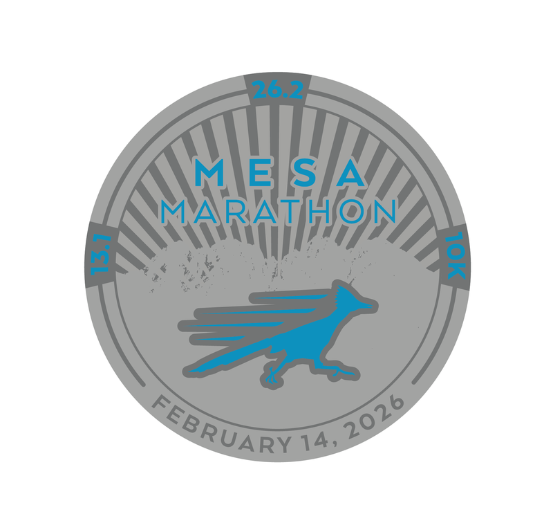 Round silver pin with roadrunner logo in middle with all three race distances along the edge.