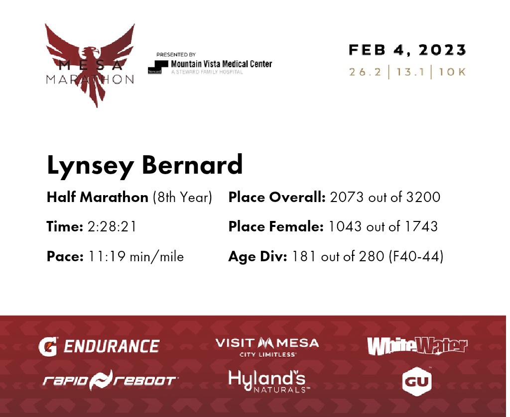 | Finish | 13.1 | 2:28:21 | 11:19/miles | 1.0 | 12:40 | 12:39/miles | 2073 | 1043 F | 181 F40-44 |