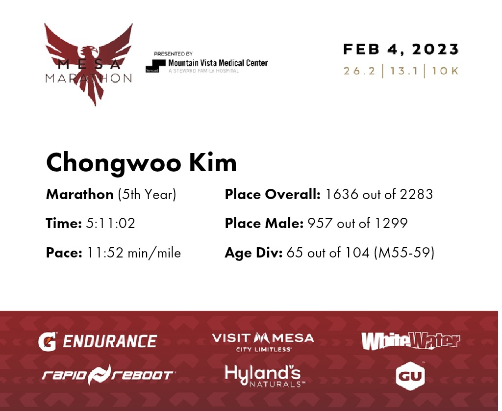 | Finish | 26.2 | 5:11:02 | 11:52/miles | 1.0 | 14:15 | 14:14/miles | 1636 | 957 M | 65 M55-59 |