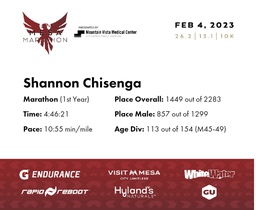 | Finish | 26.2 | 4:46:21 | 10:55/miles | 1.0 | 12:49 | 12:48/miles | 1449 | 857 M | 113 M45-49 |