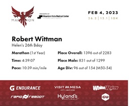 | 1 Mile To Go | 25.2 | 4:25:49 | 10:32/miles | 2.1 | 24:11 | 11:30/miles | 1346 | 800 M | 93 M50-54 |