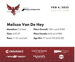 | Finish | 26.2 | 4:57:47 | 11:21/miles | 1.0 | 12:31 | 12:30/miles | 1561 | 645 F | 77 F25-29 |