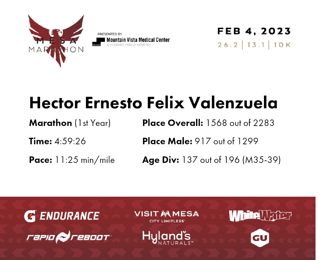 | Finish | 26.2 | 4:59:26 | 11:25/miles | 1.0 | 19:30 | 19:29/miles | 1568 | 917 M | 137 M35-39 |