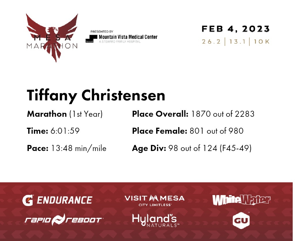 | Finish | 26.2 | 6:01:59 | 13:48/miles | 1.0 | 14:24 | 14:23/miles | 1870 | 801 F | 98 F45-49 |