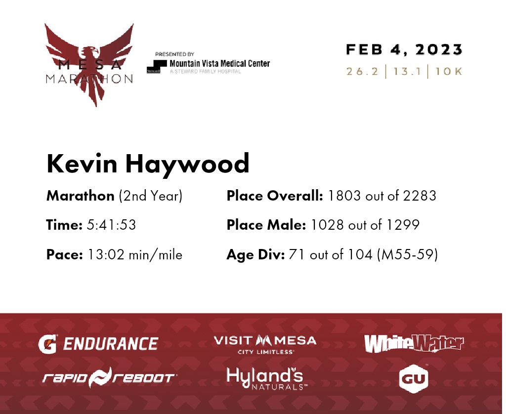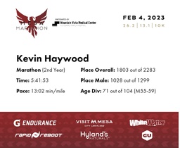 | 1 Mile To Go | 25.2 | 5:25:50 | 12:55/miles | 2.1 | 33:57 | 16:09/miles | 1756 | 1000 M | 69 M55-59 |