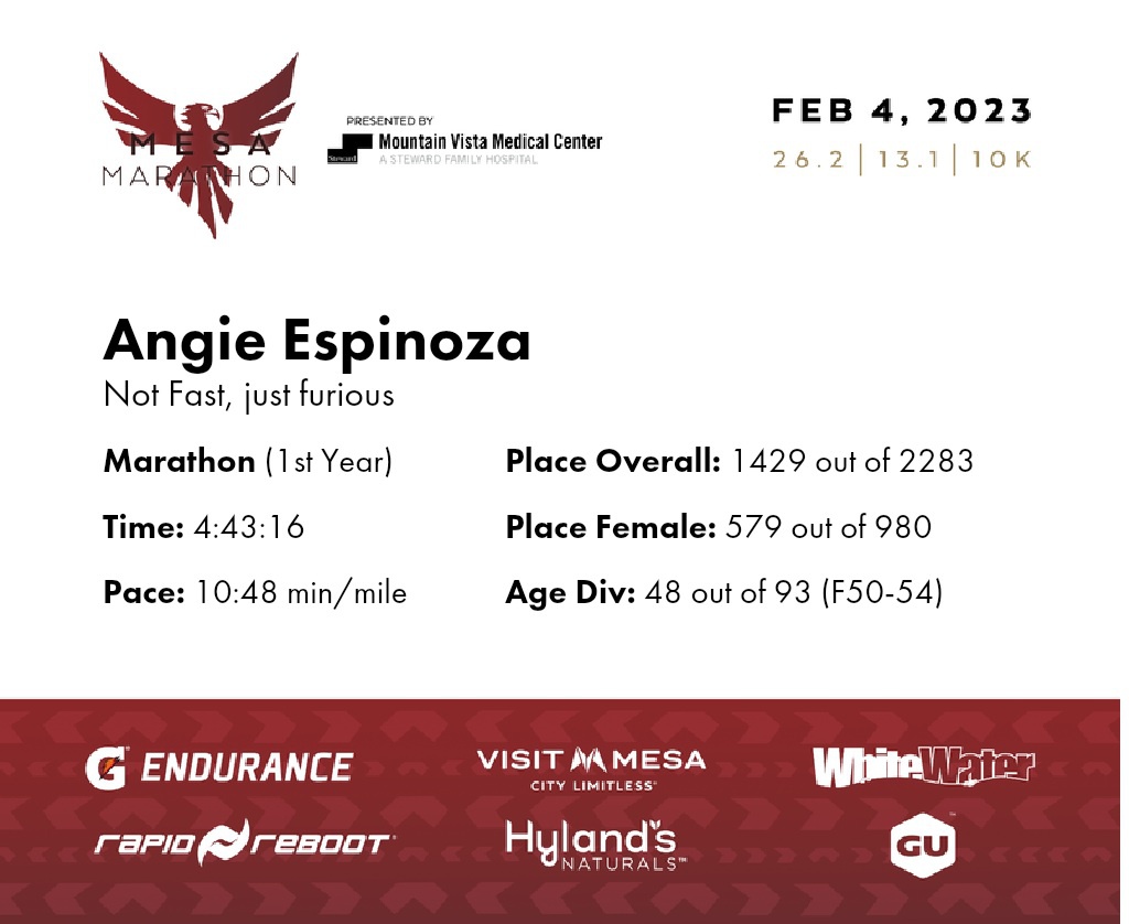 | 1 Mile To Go | 25.2 | 4:32:45 | 10:49/miles | 2.1 | 23:27 | 11:09/miles | 1407 | 573 F | 47 F50-54 |