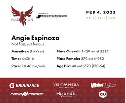 | Finish | 26.2 | 4:43:16 | 10:48/miles | 1.0 | 10:31 | 10:30/miles | 1429 | 579 F | 48 F50-54 |