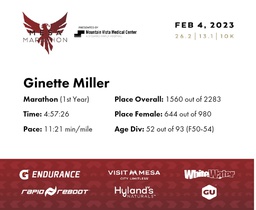 | 5 Miles To Go | 21.2 | 3:57:58 | 11:13/miles | 1.2 | 16:50 | 14:01/miles | 1594 | 657 F | 54 F50-54 |