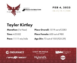 | Finish | 26.2 | 4:53:02 | 11:11/miles | 1.0 | 10:20 | 10:19/miles | 1519 | 630 F | 73 F25-29 |