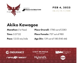 | 1 Mile To Go | 25.2 | 5:25:33 | 12:55/miles | 2.1 | 28:33 | 13:35/miles | 1753 | 750 F | 137 F40-44 |