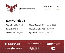 | Finish | 26.2 | 5:27:52 | 12:30/miles | 1.0 | 12:31 | 12:30/miles | 1744 | 736 F | 2 F70-74 |