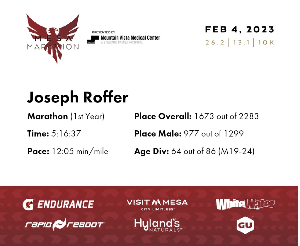 | Finish | 26.2 | 5:16:37 | 12:05/miles | 1.0 | 13:56 | 13:55/miles | 1673 | 977 M | 64 M19-24 |