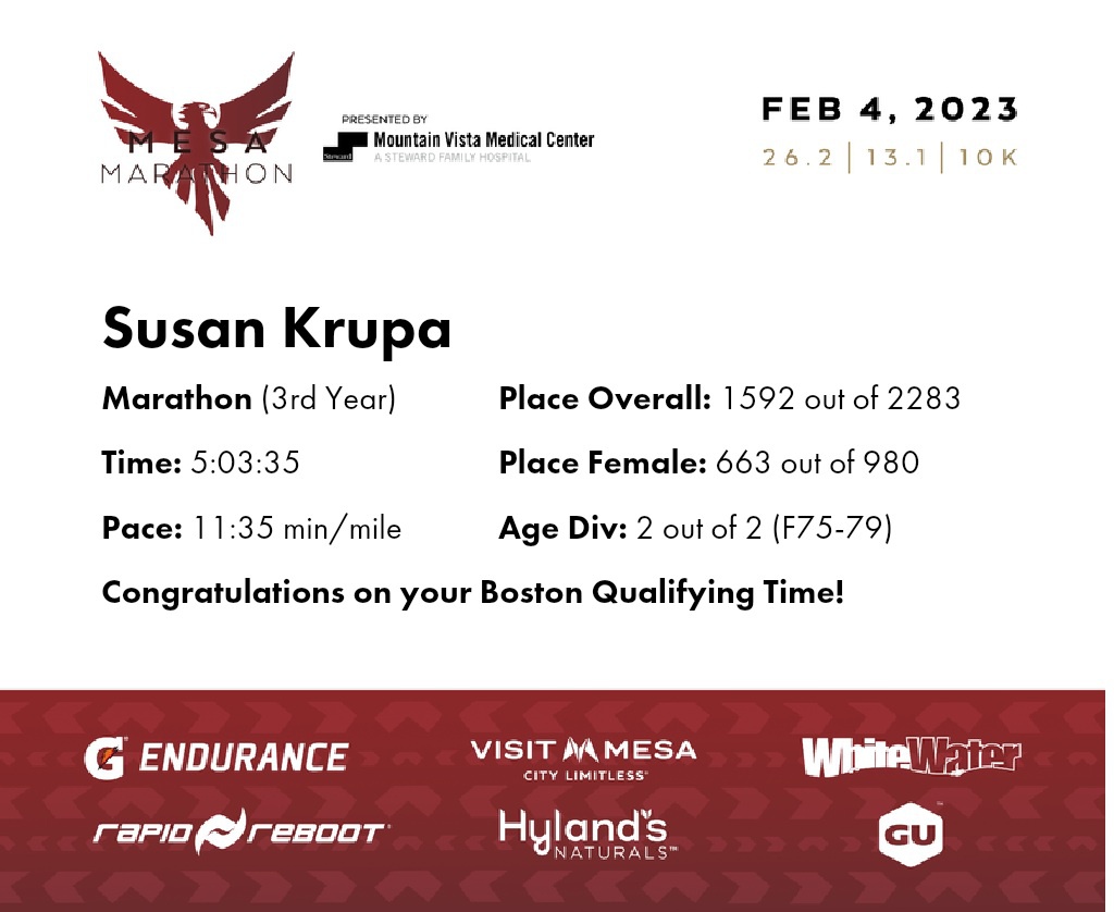 | 10K to Go | 20.0 | 3:46:12 | 11:18/miles | 5.9 | 1:10:49 | 12:00/miles | 1640 | 672 F | 2 F75-79 |