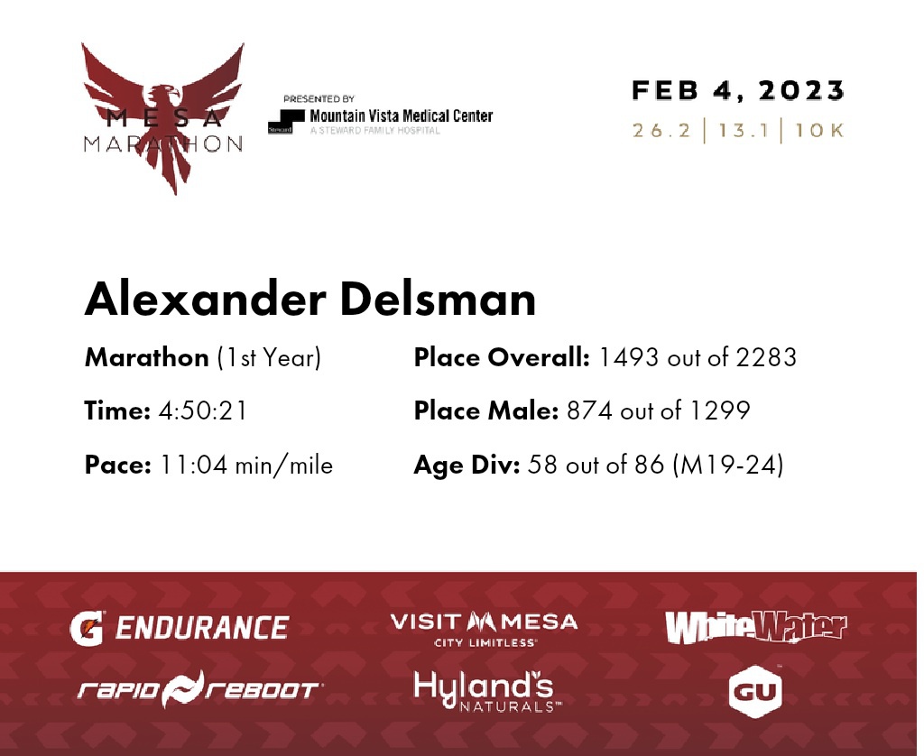 | Finish | 26.2 | 4:50:21 | 11:04/miles | 1.0 | 13:21 | 13:20/miles | 1493 | 874 M | 58 M19-24 |