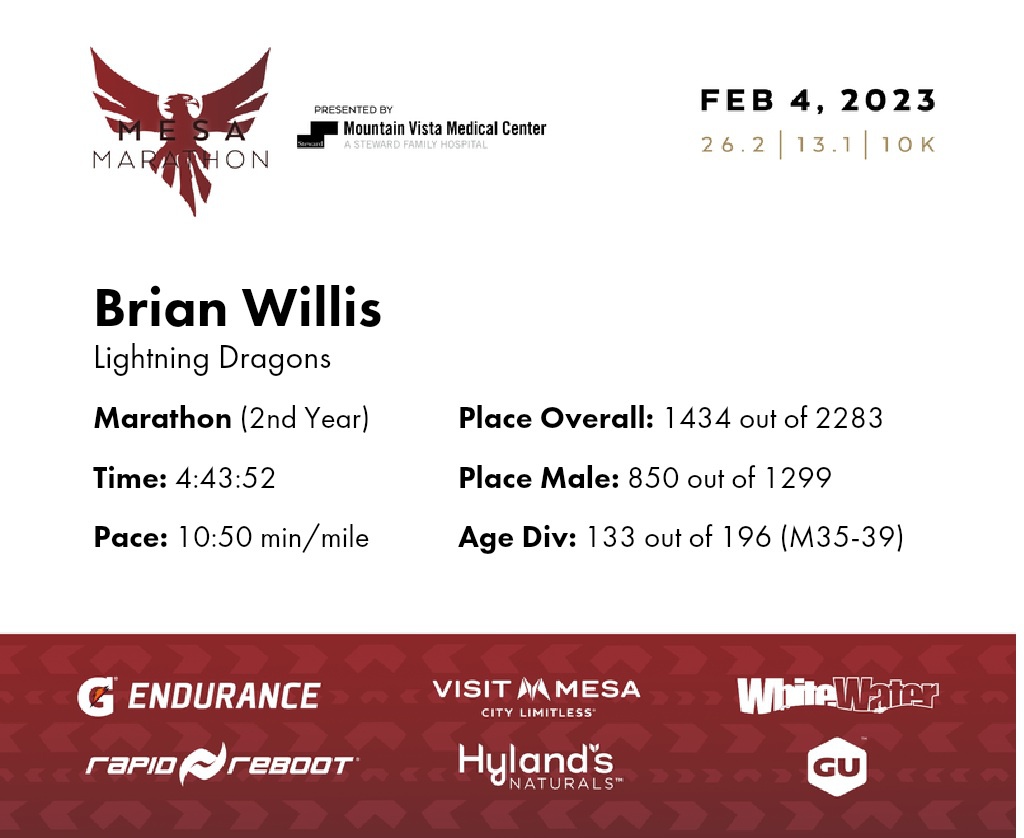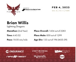 | 1 Mile To Go | 25.2 | 4:33:41 | 10:51/miles | 2.1 | 22:39 | 10:46/miles | 1414 | 836 M | 131 M35-39 |