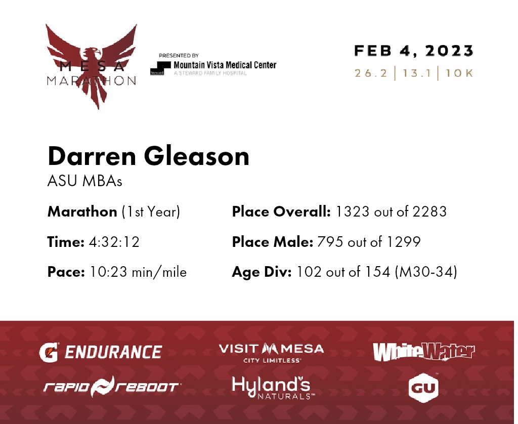 | Finish | 26.2 | 4:32:12 | 10:23/miles | 1.0 | 8:38 | 8:37/miles | 1323 | 795 M | 102 M30-34 |