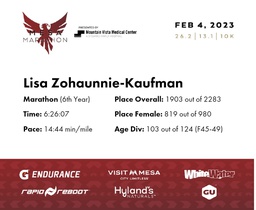 | Finish | 26.2 | 6:26:07 | 14:44/miles | 1.0 | 18:11 | 18:10/miles | 1903 | 819 F | 103 F45-49 |