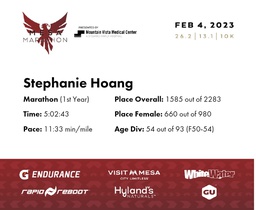 | Finish | 26.2 | 5:02:43 | 11:33/miles | 1.0 | 12:15 | 12:14/miles | 1585 | 660 F | 54 F50-54 |