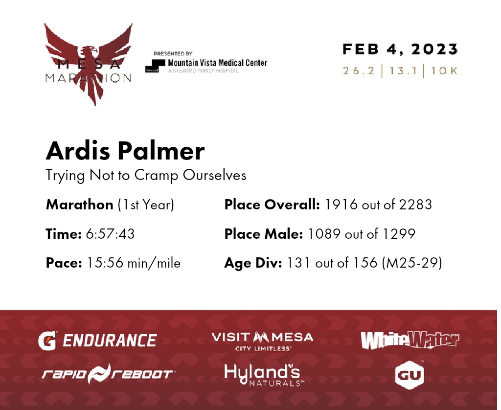 | Finish | 26.2 | 6:57:43 | 15:56/miles | 1.0 | 17:38 | 17:37/miles | 1916 | 1089 M | 131 M25-29 |
