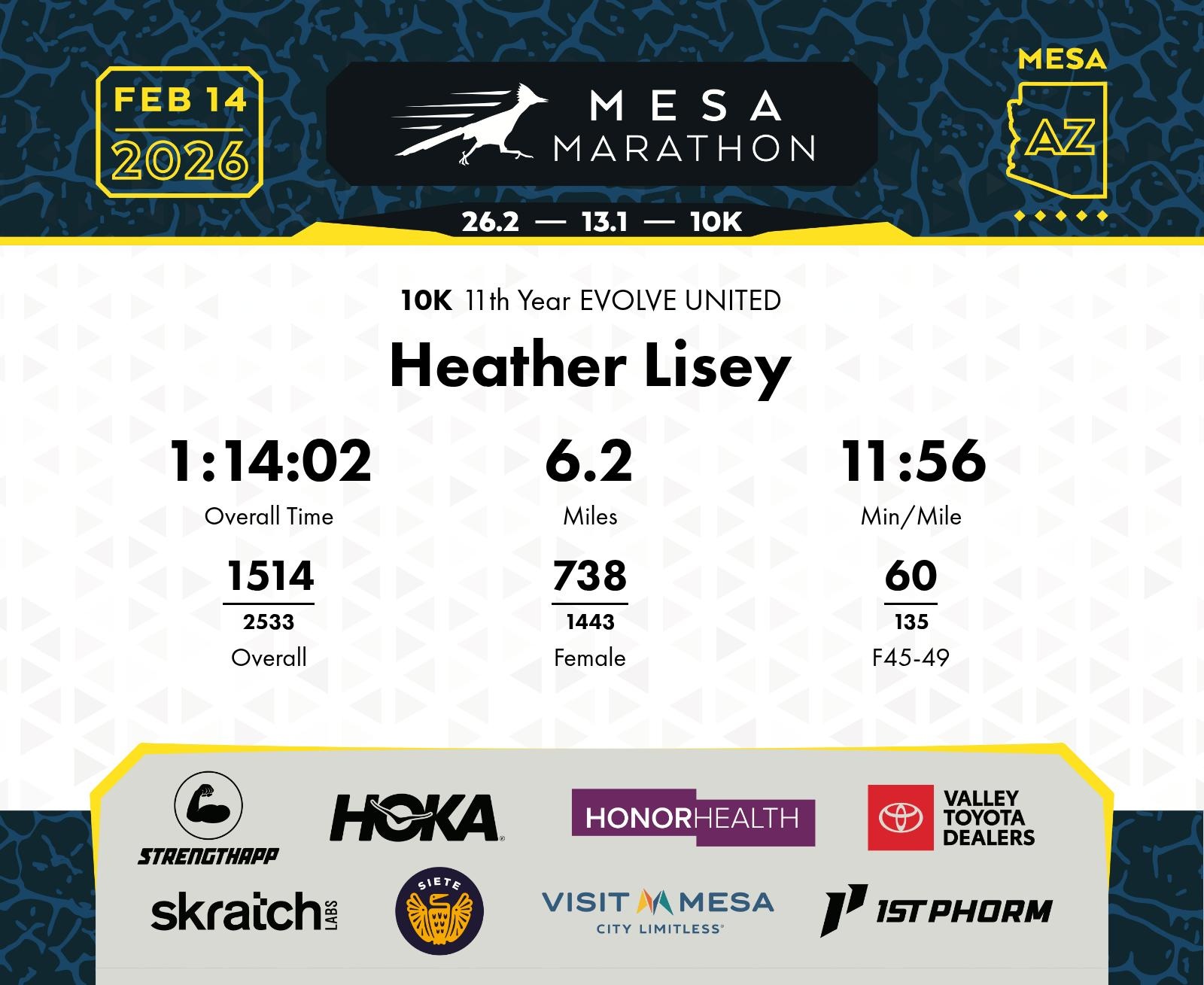 Date: Feb. 14, 2026 Participant: Heather Lisey #20869 Race: 2026 Mesa 10K Distance: 6.2 miles