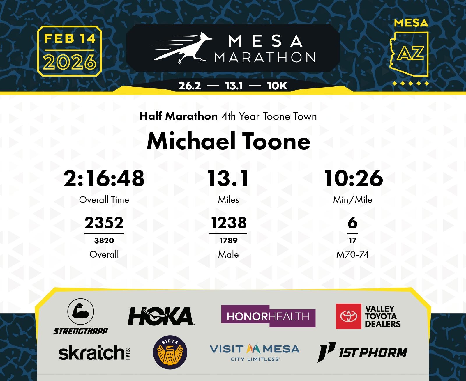 Date: Feb. 14, 2026 Participant: Michael Toone #17416 Race: 2026 Mesa Half Marathon Distance: 13.1 miles