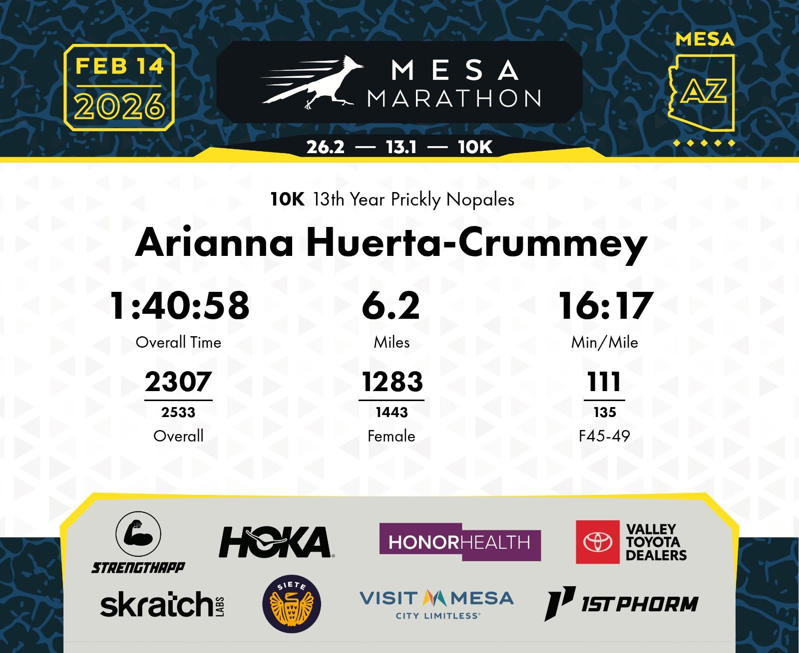 Date: Feb. 14, 2026 Participant: Arianna Huerta-Crummey #18730 Race: 2026 Mesa 10K Distance: 6.2 miles