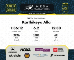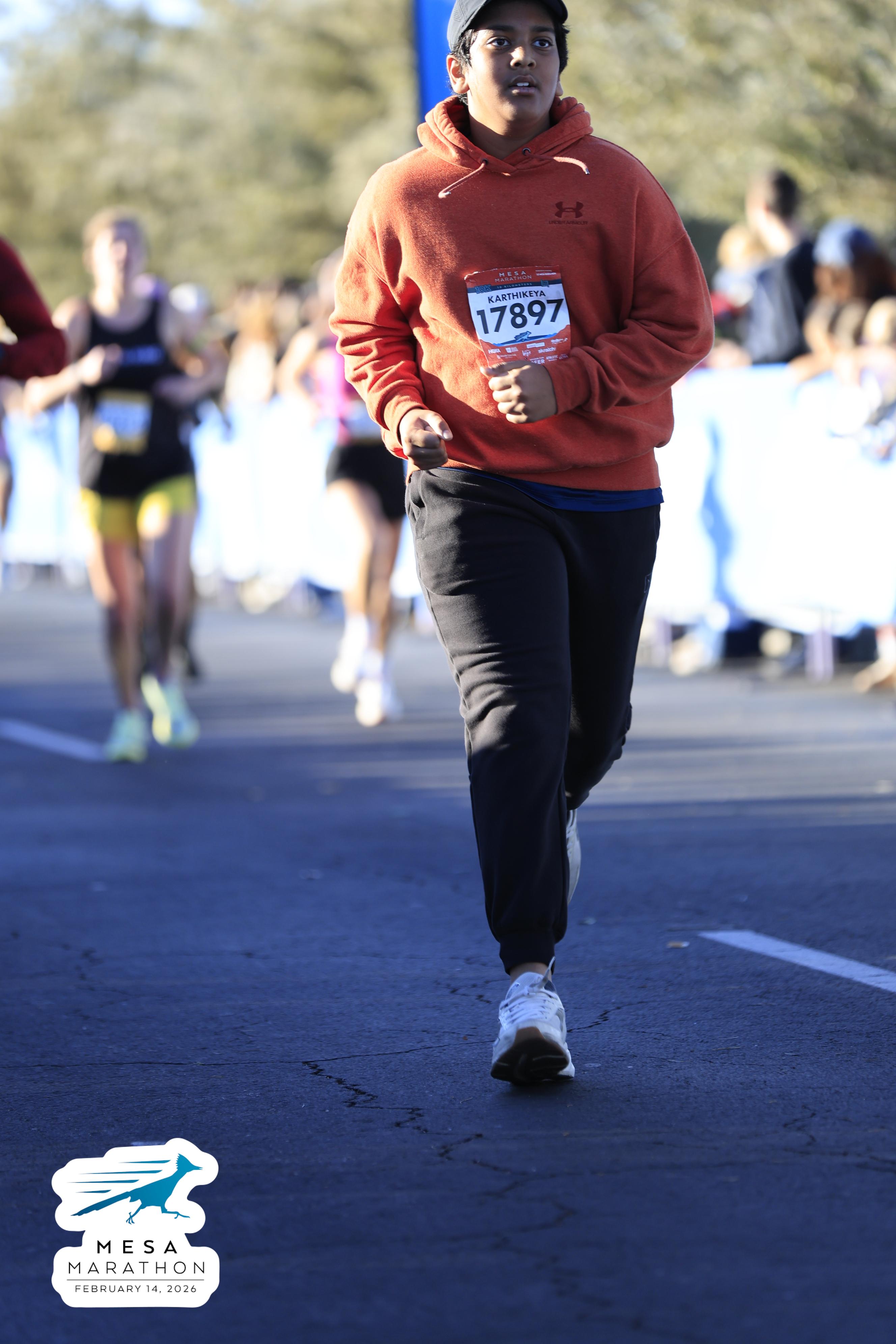 Date: Feb. 14, 2026 Participant: Karthikeya Alla #17897 Race: 2026 Mesa 10K Distance: 6.2 miles