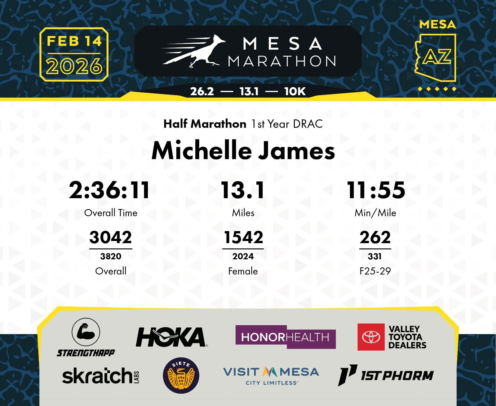 Date: Feb. 14, 2026 Participant: Michelle James #15819 Race: 2026 Mesa Half Marathon Distance: 13.1 miles