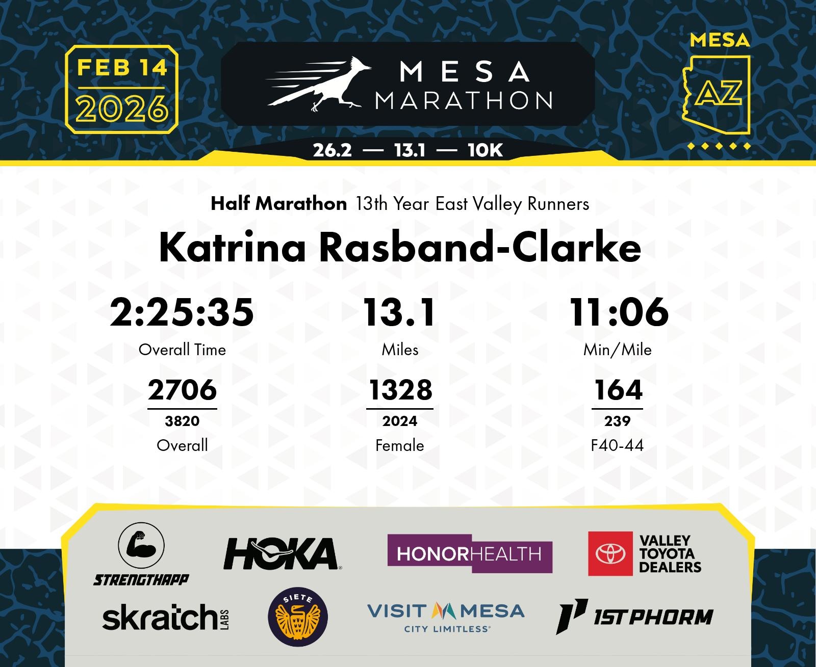 Date: Feb. 14, 2026 Participant: Katrina Rasband-Clarke #16835 Race: 2026 Mesa Half Marathon Distance: 13.1 miles