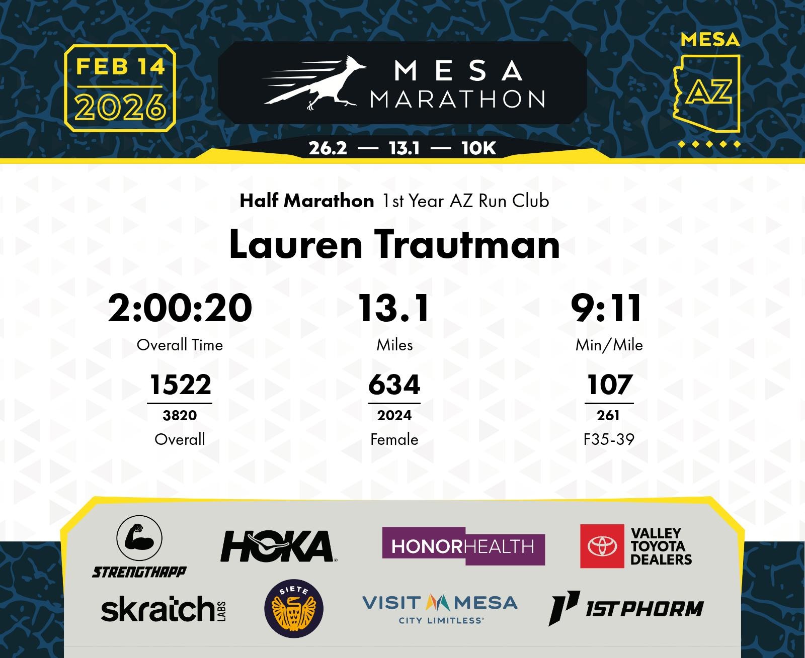 Date: Feb. 14, 2026 Participant: Lauren Trautman #17435 Race: 2026 Mesa Half Marathon Distance: 13.1 miles
