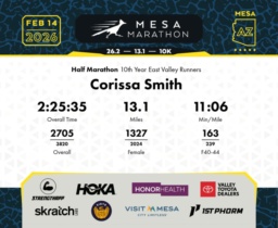 Date: Feb. 14, 2026 Participant: Corissa Smith #17199 Race: 2026 Mesa Half Marathon Distance: 13.1 miles