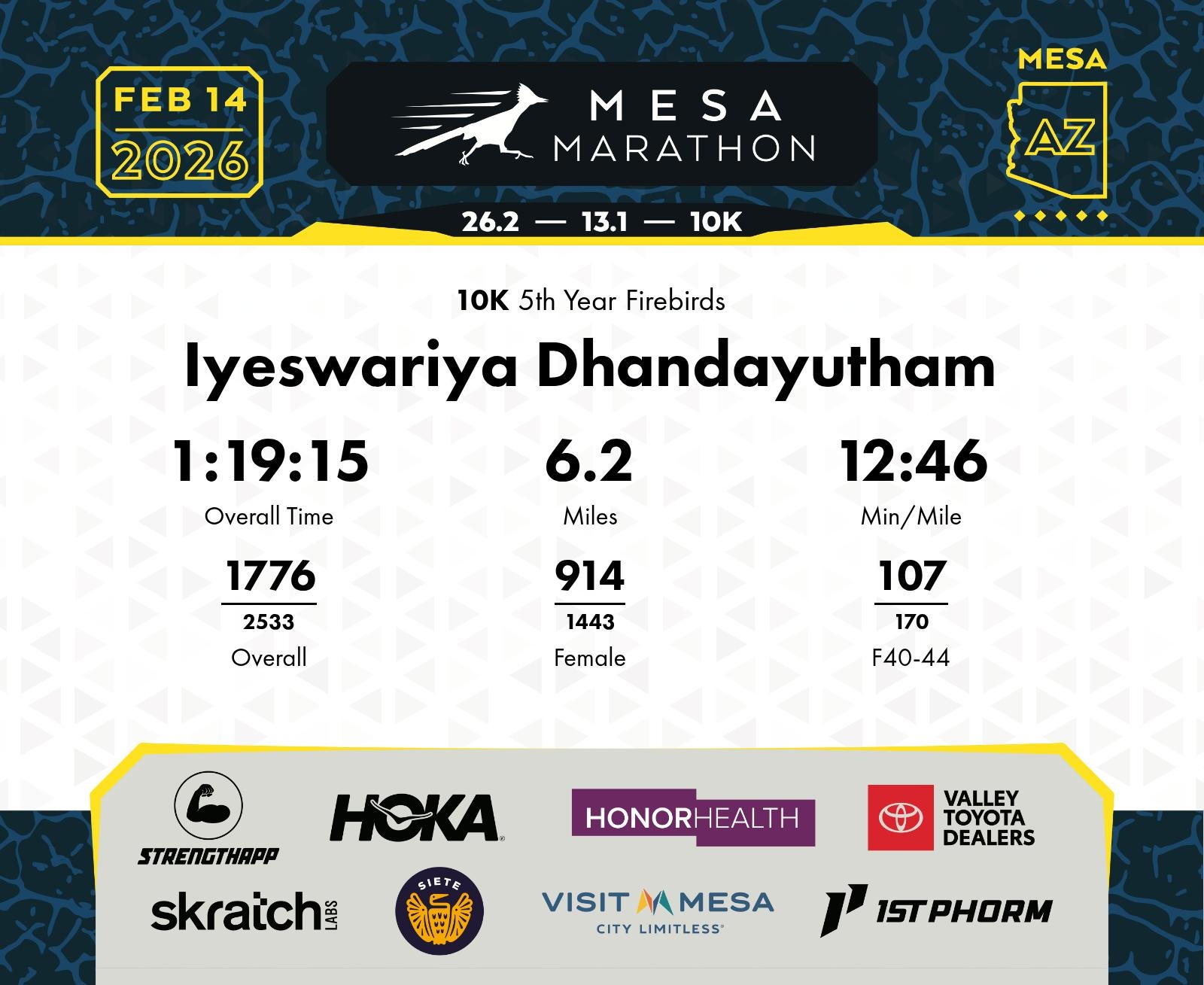 Date: Feb. 14, 2026 Participant: Iyeswariya Dhandayutham #18365 Race: 2026 Mesa 10K Distance: 6.2 miles