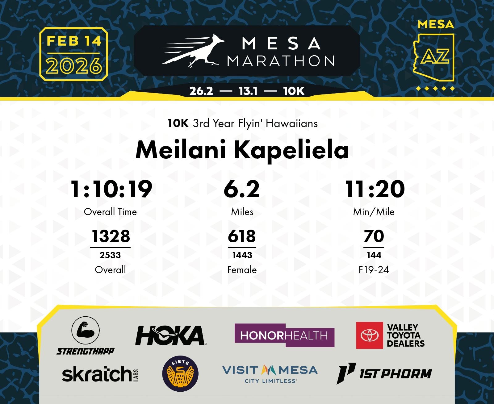 Date: Feb. 14, 2026 Participant: Meilani Kapeliela #18822 Race: 2026 Mesa 10K Distance: 6.2 miles