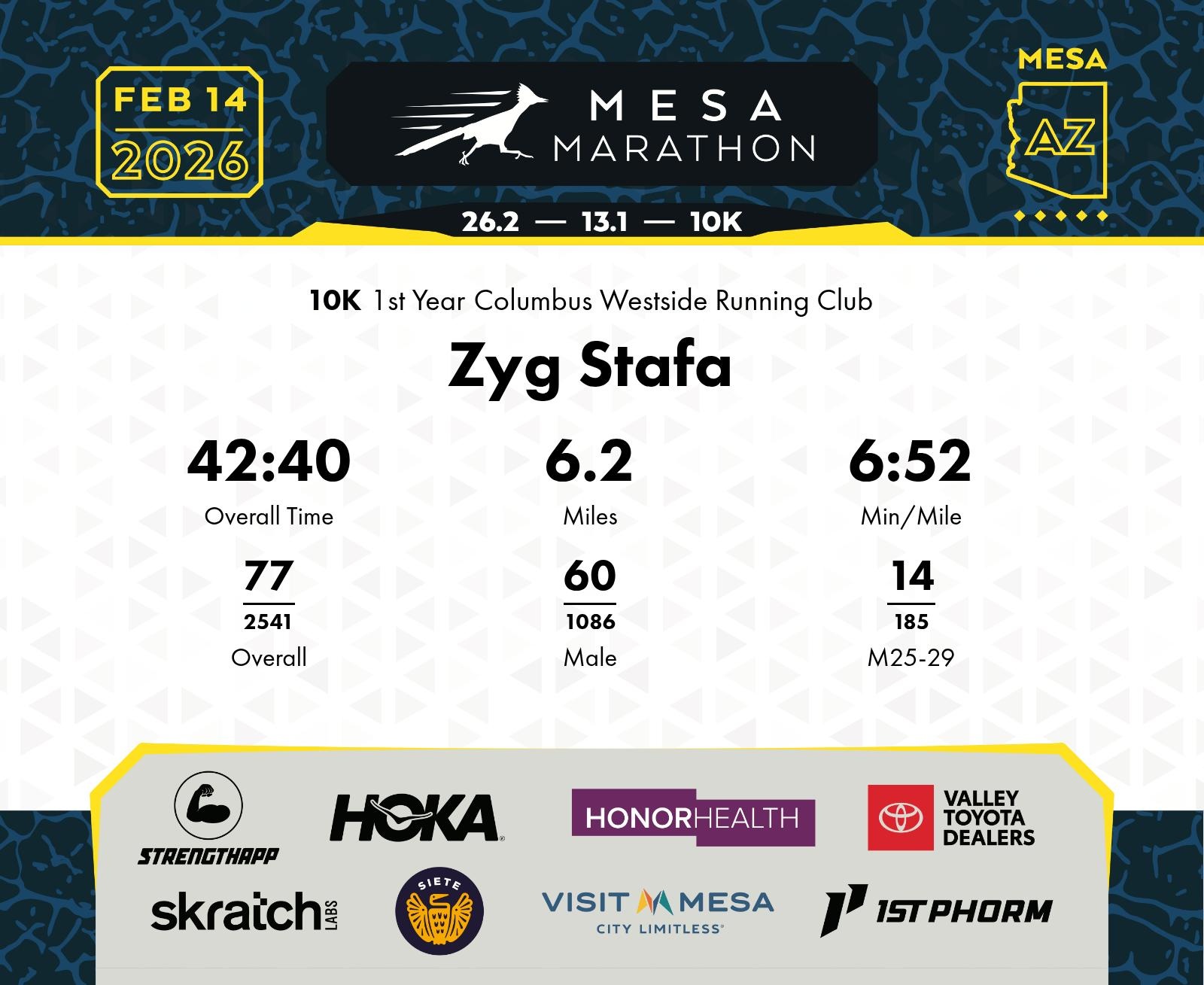 Date: Feb. 14, 2026 Participant: Zyg Stafa #19613 Race: 2026 Mesa 10K Distance: 6.2 miles