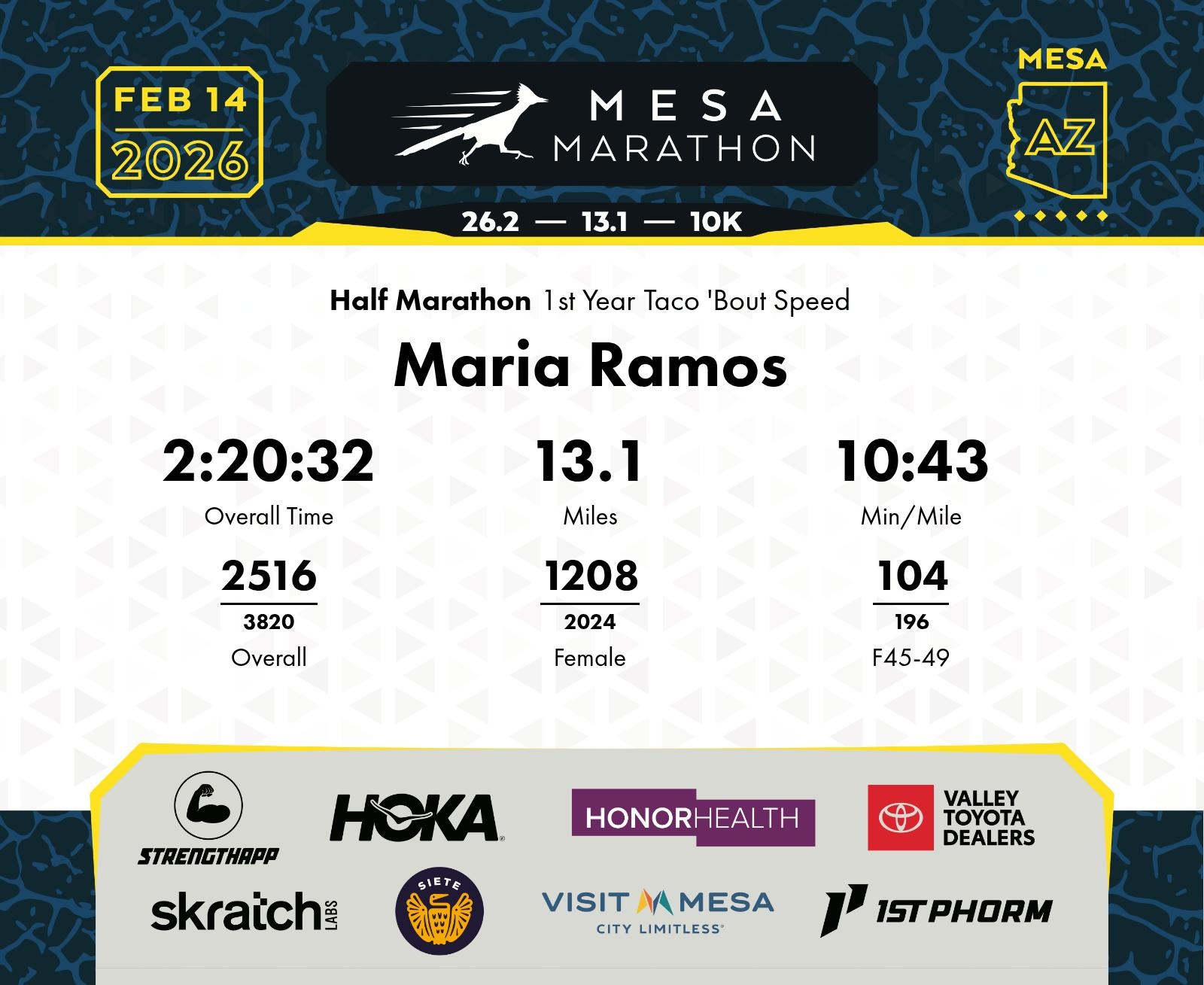 Date: Feb. 14, 2026 Participant: Maria Ramos #16827 Race: 2026 Mesa Half Marathon Distance: 13.1 miles