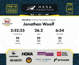 Date: Feb. 14, 2026 Participant: Jonathan Woolf #13973 Race: 2026 Mesa Marathon Distance: 26.2 miles