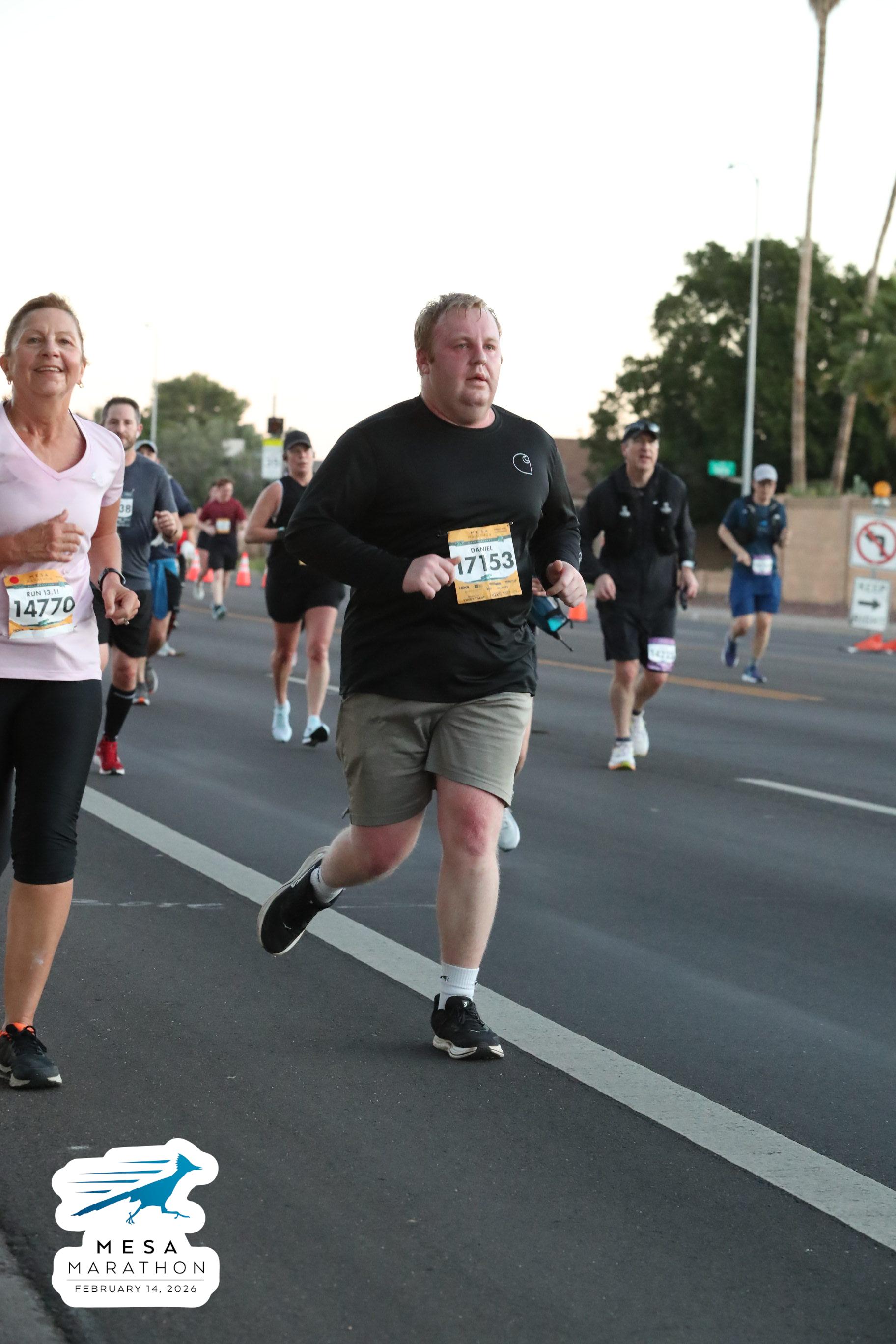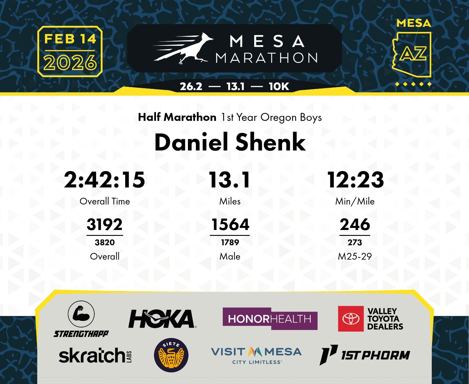 Date: Feb. 14, 2026 Participant: Daniel Shenk #17153 Race: 2026 Mesa Half Marathon Distance: 13.1 miles