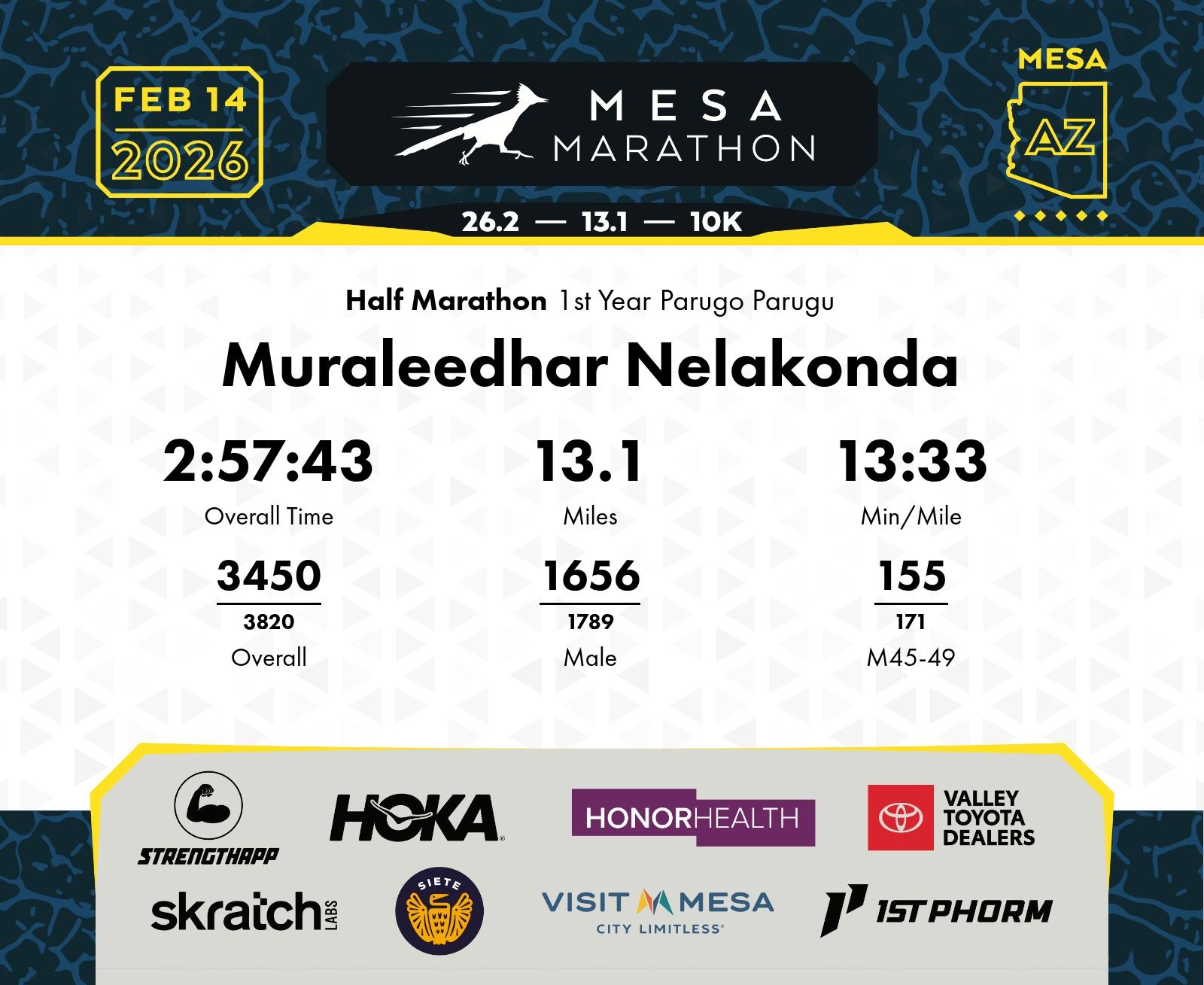 Date: Feb. 14, 2026 Participant: Muraleedhar Nelakonda #16523 Race: 2026 Mesa Half Marathon Distance: 13.1 miles