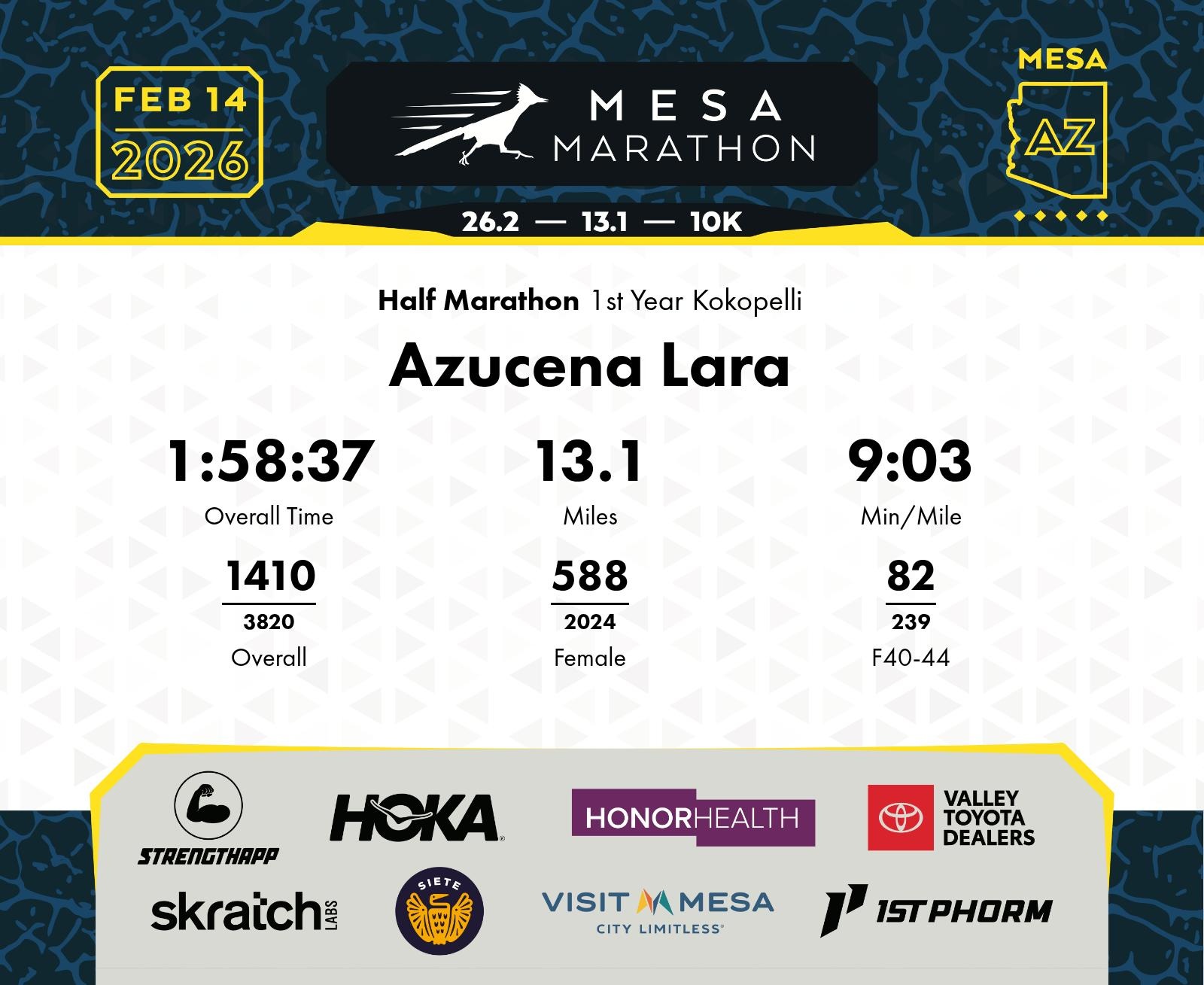 Date: Feb. 14, 2026 Participant: Azucena Lara #16059 Race: 2026 Mesa Half Marathon Distance: 13.1 miles