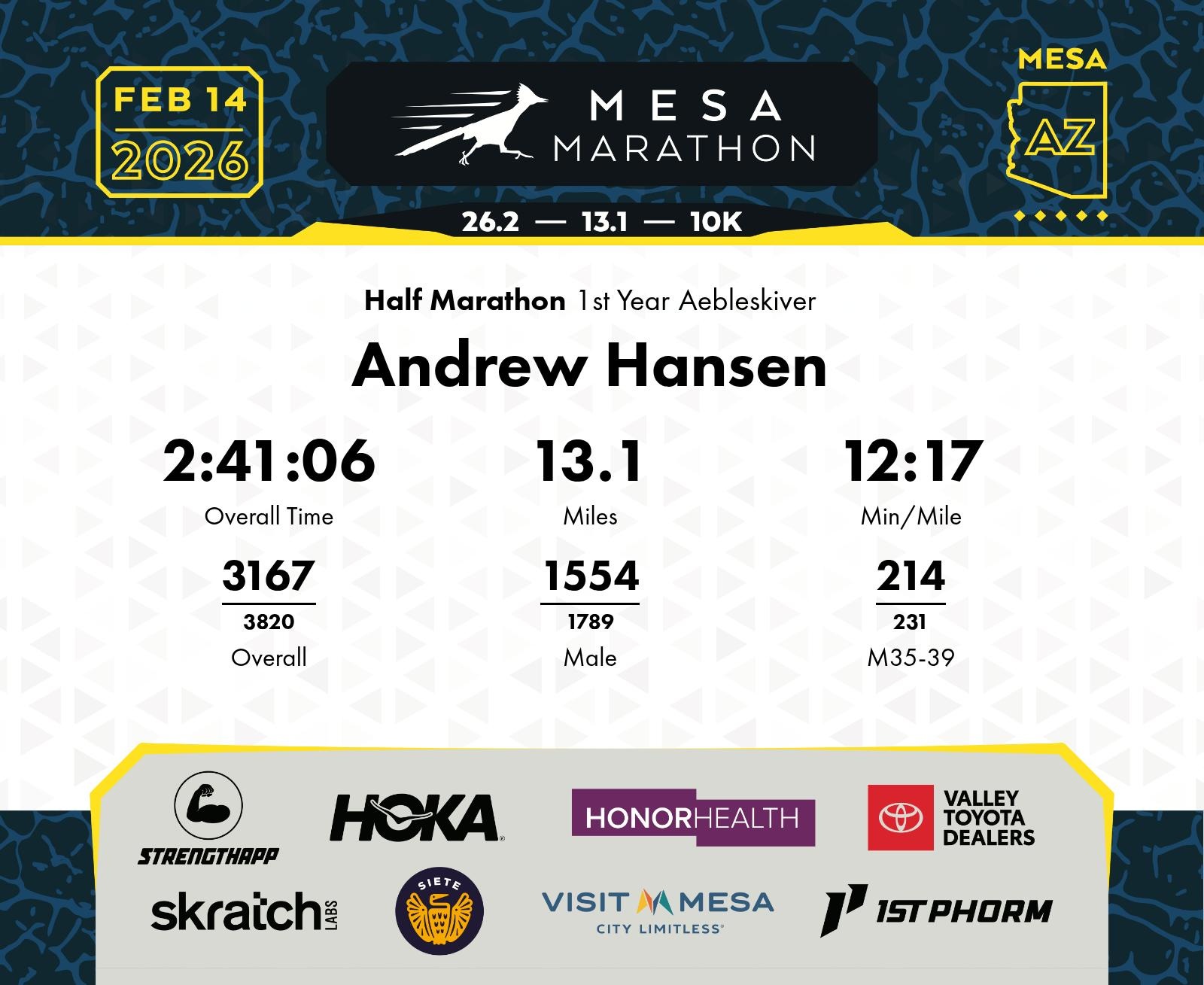 Date: Feb. 14, 2026 Participant: Andrew Hansen #15580 Race: 2026 Mesa Half Marathon Distance: 13.1 miles