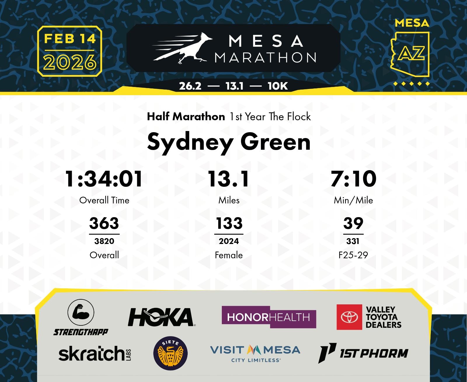 Date: Feb. 14, 2026 Participant: Sydney Green #15502 Race: 2026 Mesa Half Marathon Distance: 13.1 miles