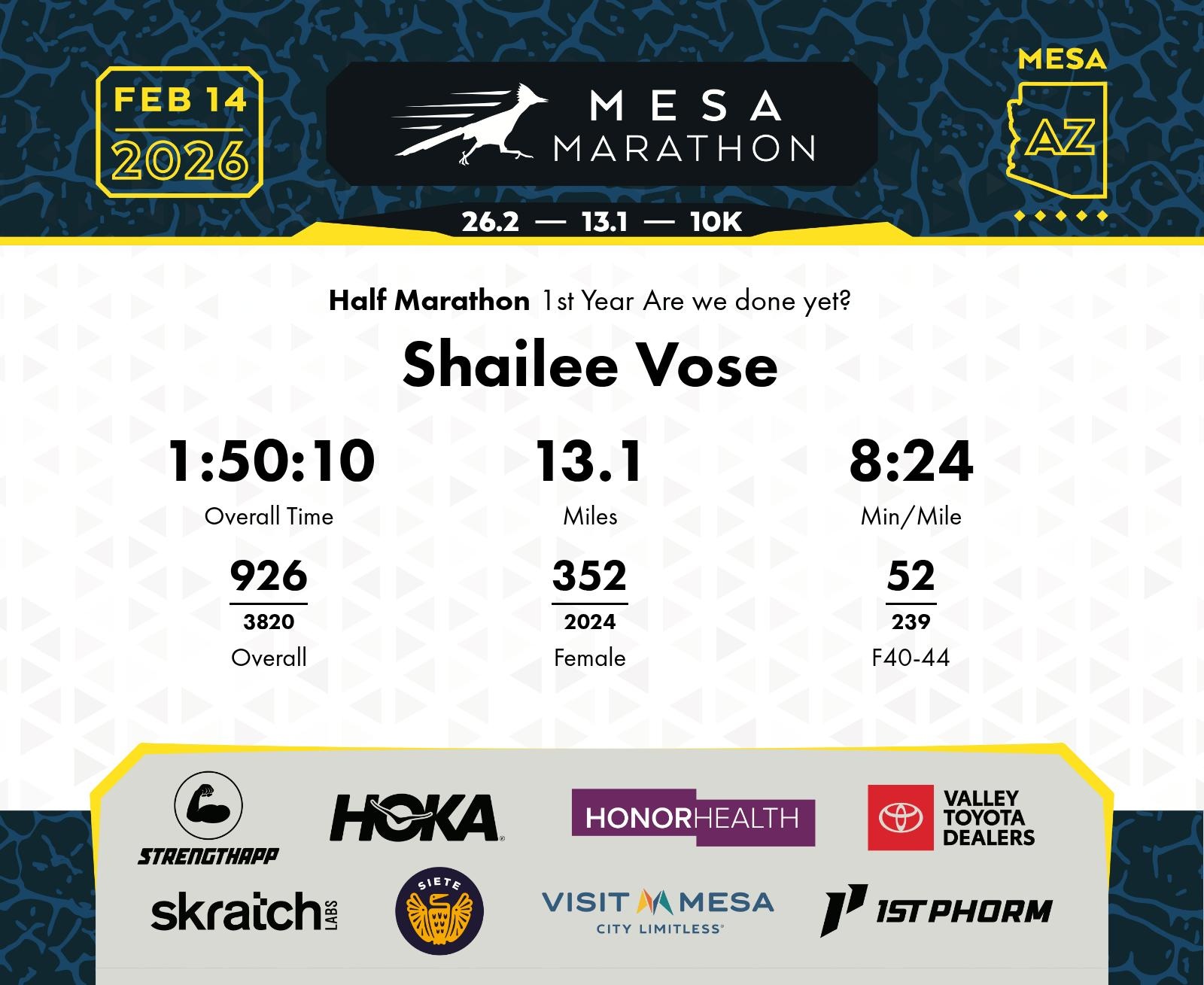 Date: Feb. 14, 2026 Participant: Shailee Vose #17533 Race: 2026 Mesa Half Marathon Distance: 13.1 miles