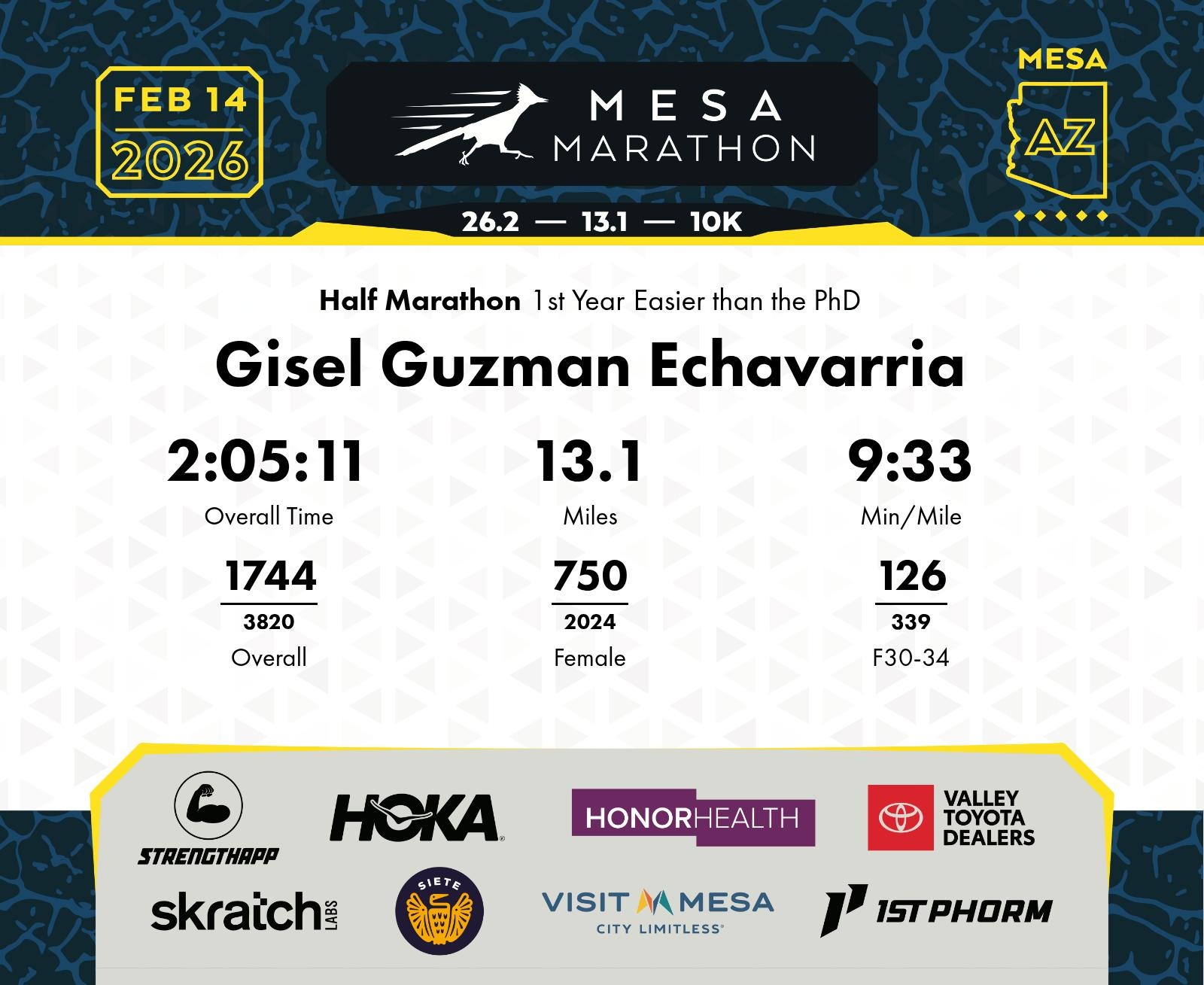 Date: Feb. 14, 2026 Participant: Gisel Guzman Echavarria #15539 Race: 2026 Mesa Half Marathon Distance: 13.1 miles