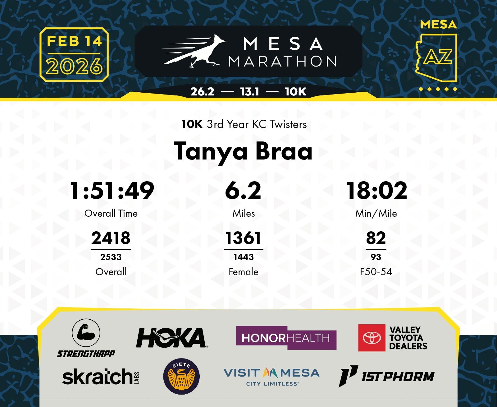 Date: Feb. 14, 2026 Participant: Tanya Braa #20631 Race: 2026 Mesa 10K Distance: 6.2 miles