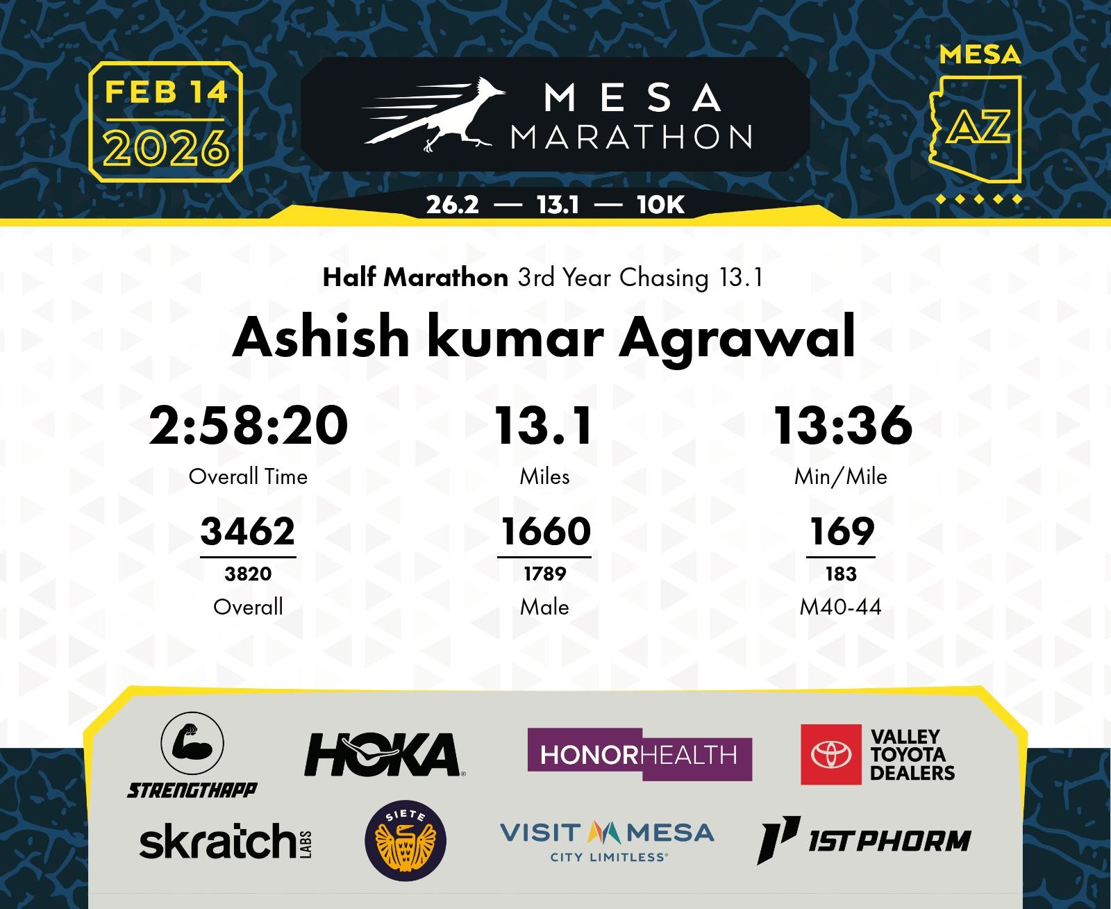 Date: Feb. 14, 2026 Participant: Ashish kumar Agrawal #14408 Race: 2026 Mesa Half Marathon Distance: 13.1 miles
