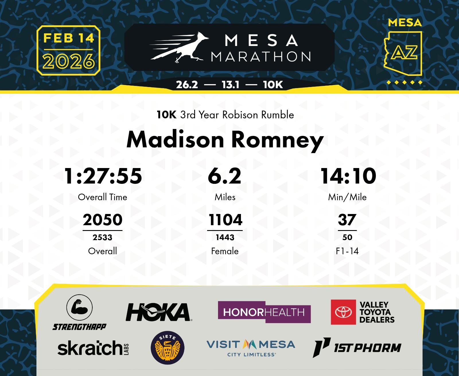 Date: Feb. 14, 2026 Participant: Madison Romney #21017 Race: 2026 Mesa 10K Distance: 6.2 miles