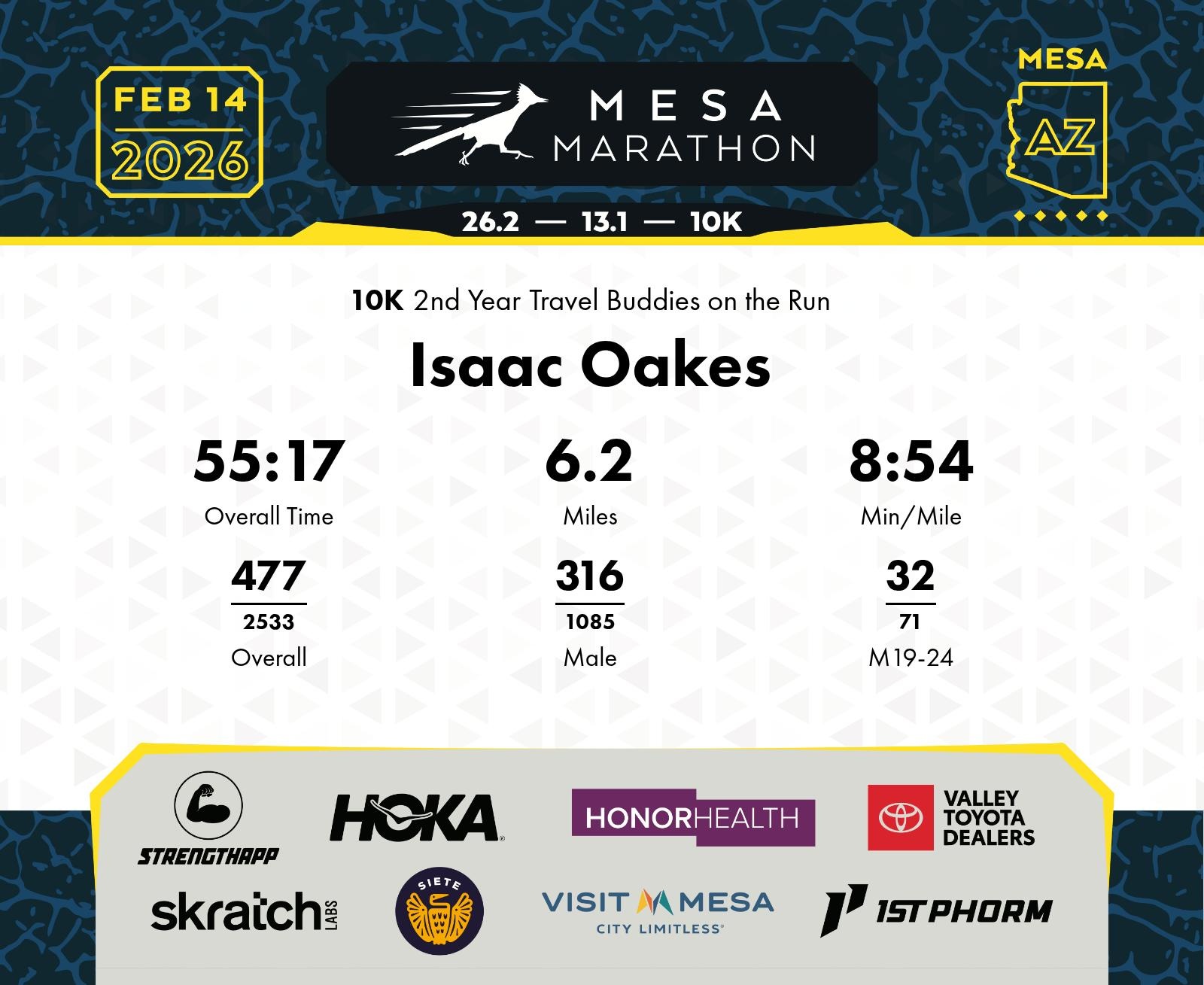 Date: Feb. 14, 2026 Participant: Isaac Oakes #19225 Race: 2026 Mesa 10K Distance: 6.2 miles