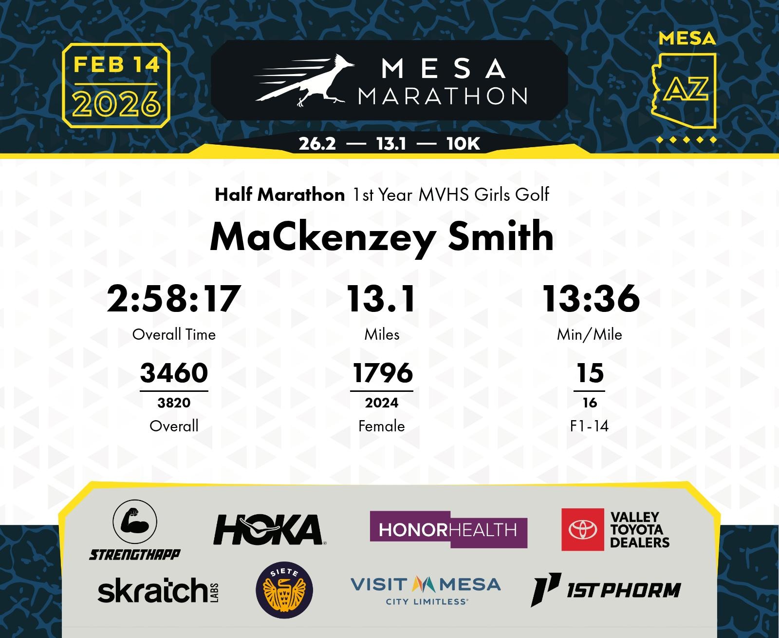 Date: Feb. 14, 2026 Participant: MaCkenzey Smith #17207 Race: 2026 Mesa Half Marathon Distance: 13.1 miles