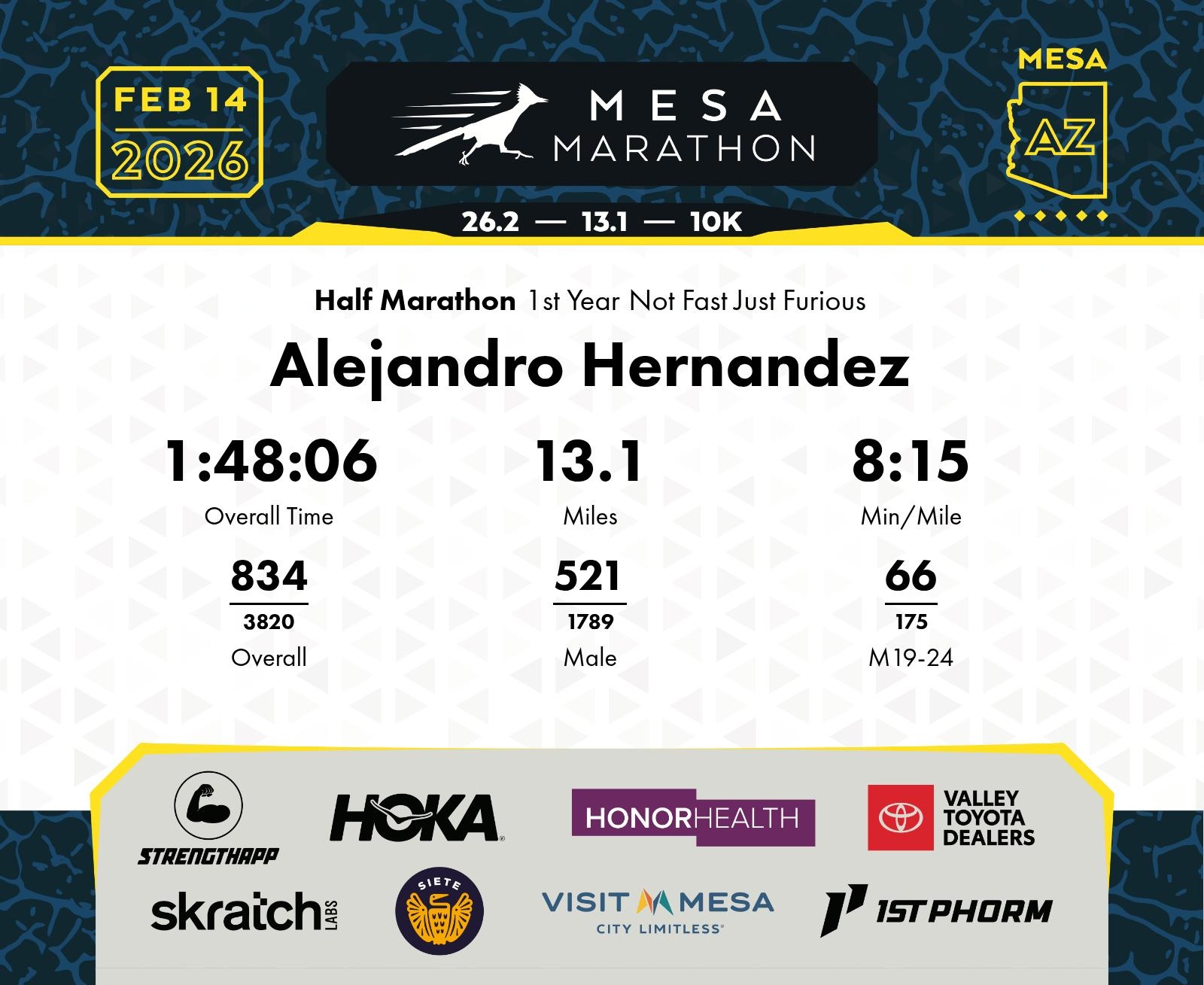 Date: Feb. 14, 2026 Participant: Alejandro Hernandez #15662 Race: 2026 Mesa Half Marathon Distance: 13.1 miles