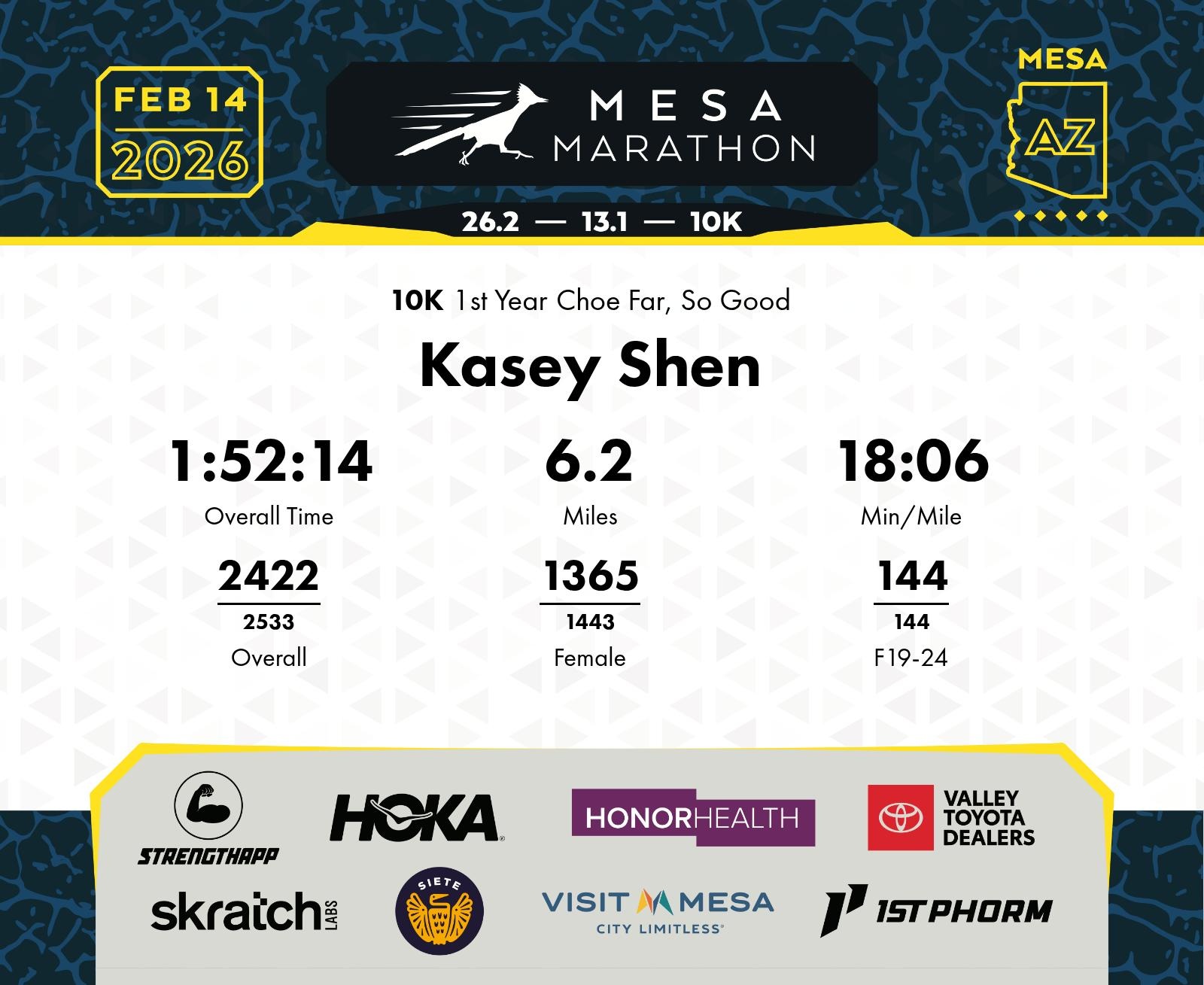 Date: Feb. 14, 2026 Participant: Kasey Shen #19540 Race: 2026 Mesa 10K Distance: 6.2 miles